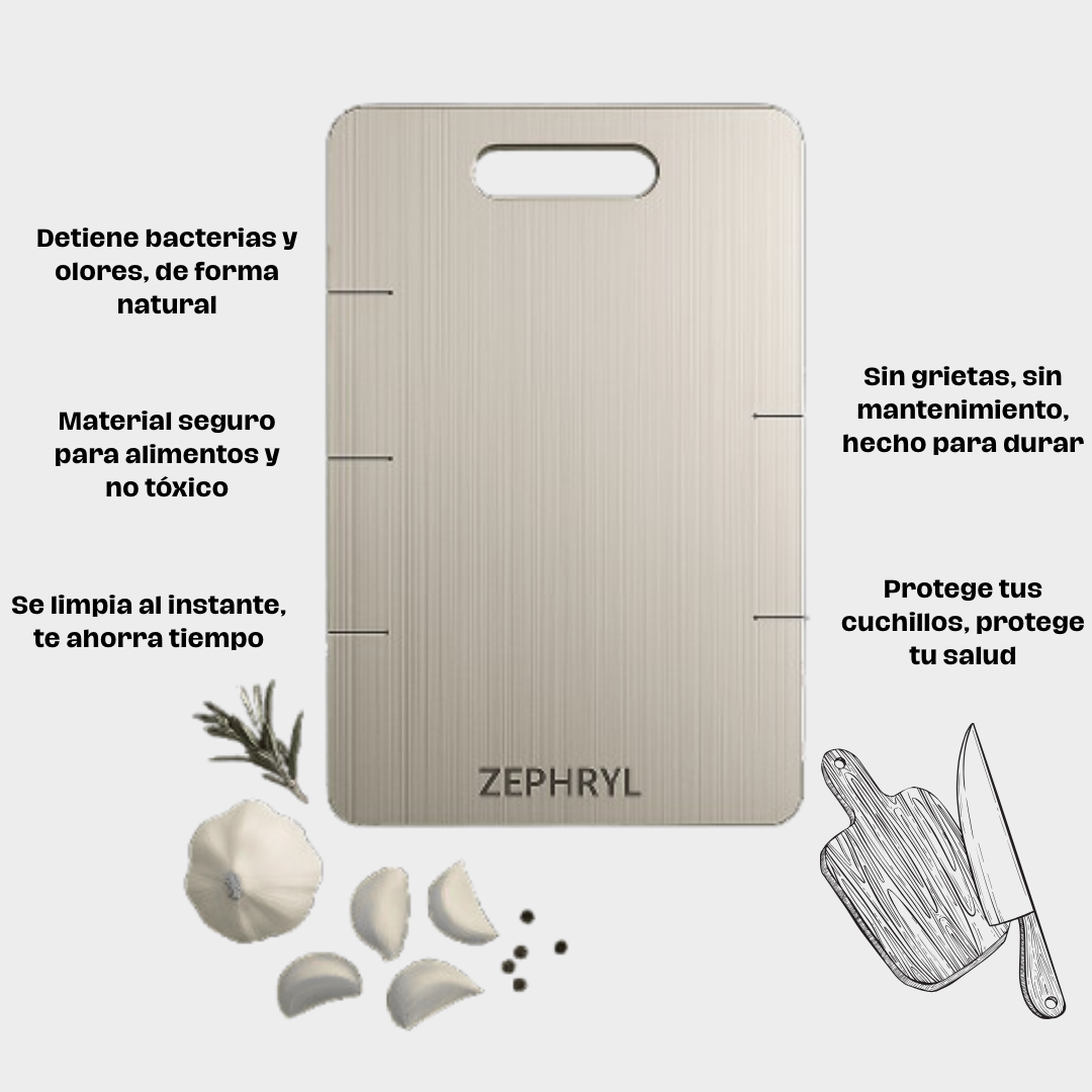 Olvídate de tablas que se rayan o se decoloran. Esta tabla de acero inoxidable con titanio es resistente a rayaduras, manchas y golpes, asegurando que luzca como nueva incluso con uso diario. Ideal para cualquier cocina que valore calidad y durabilidad.